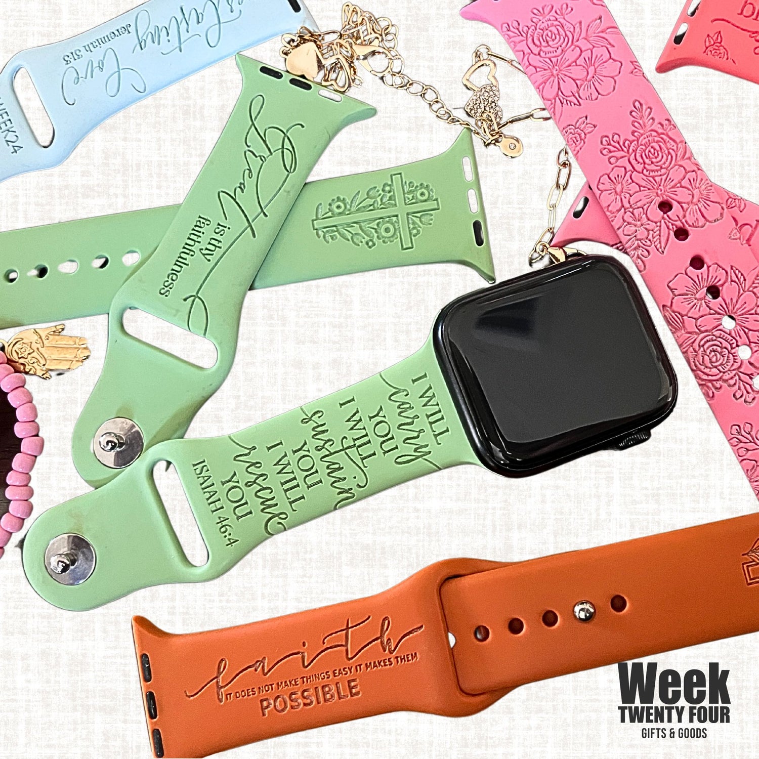 Faith-filled bands compatible with Apple Watch—engraved with scripture and encouragement to uplift you with every glance.