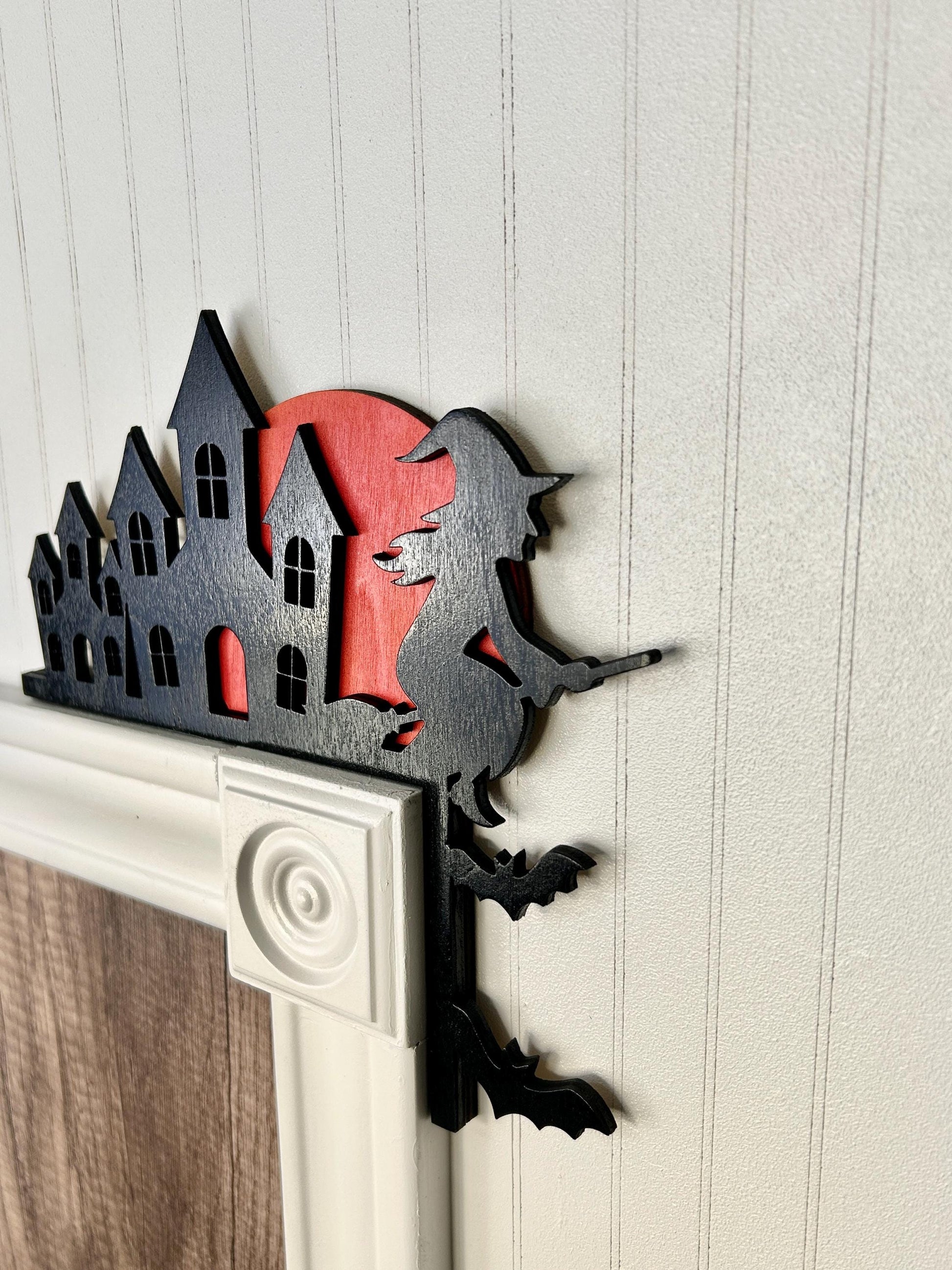 Halloween Haunted Mansion Door Corner Sign | Witch on Ledge with Blood Moon | Layered Birch Wood Gothic Decor