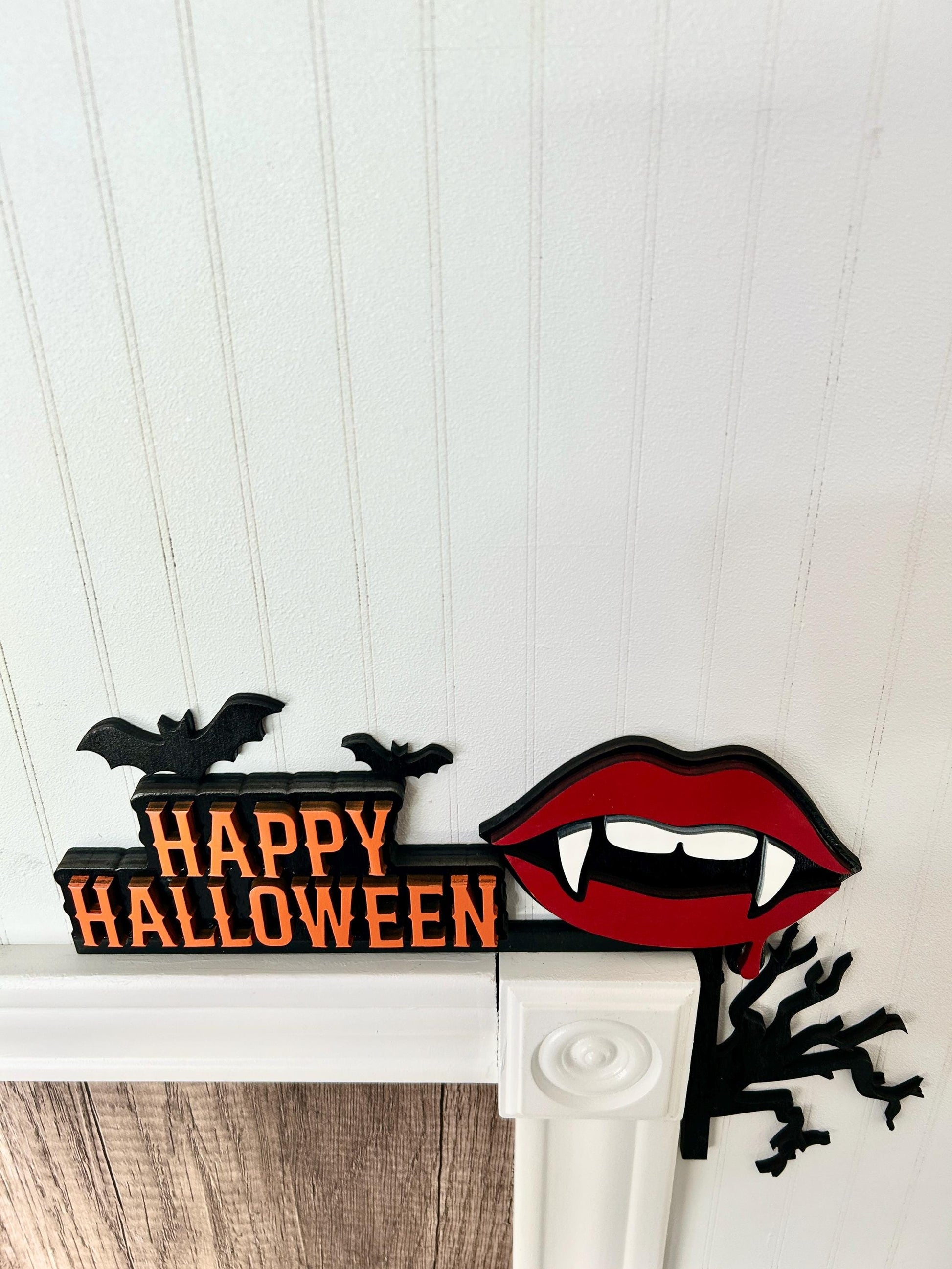Happy Halloween Door Corner Sign | Vampire Lips with Fangs & Bats | Painted Birch Wood Gothic Decor