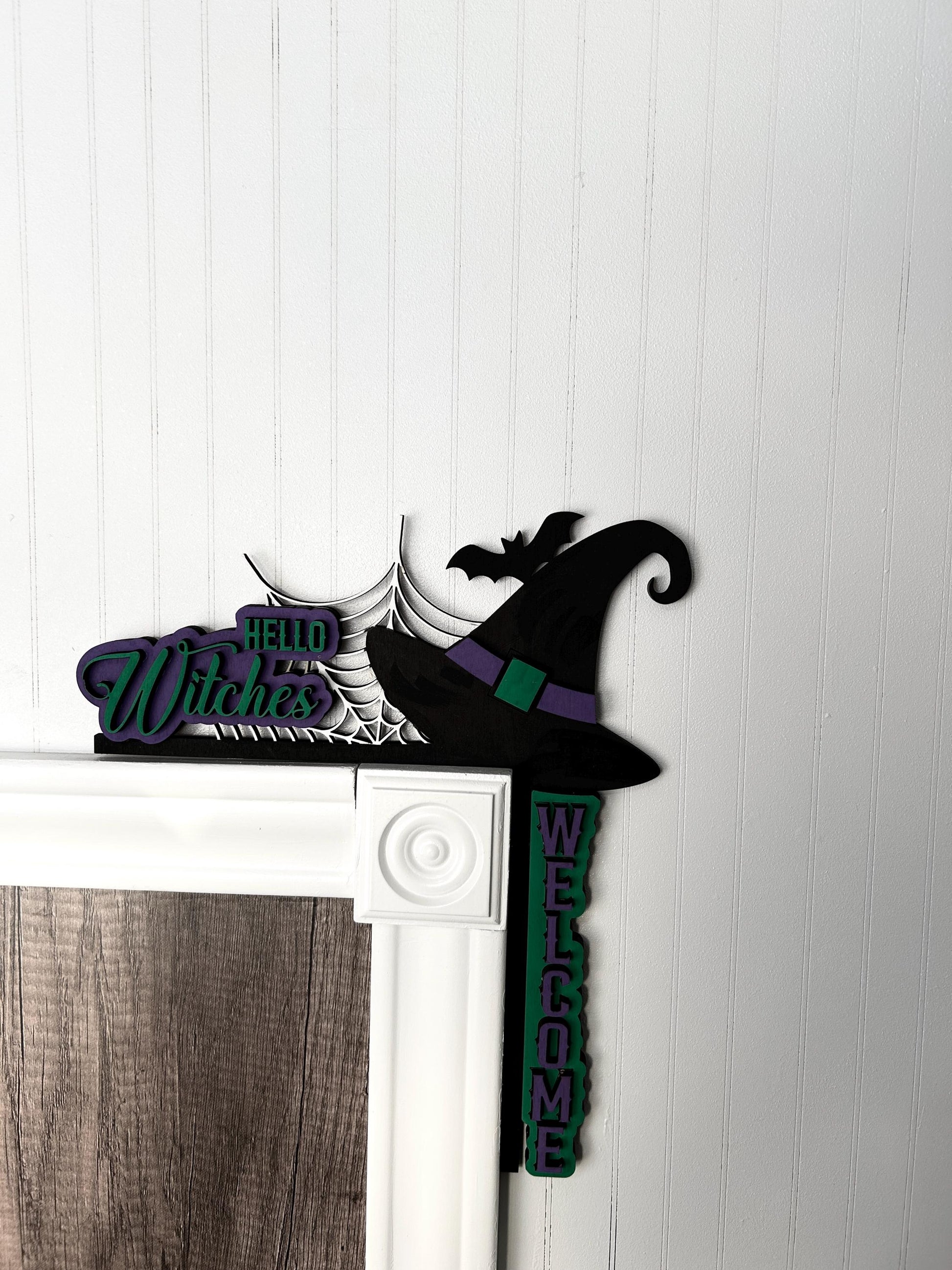 Features witch hat, spiderweb, bat, and text “Hello Witches / Welcome”