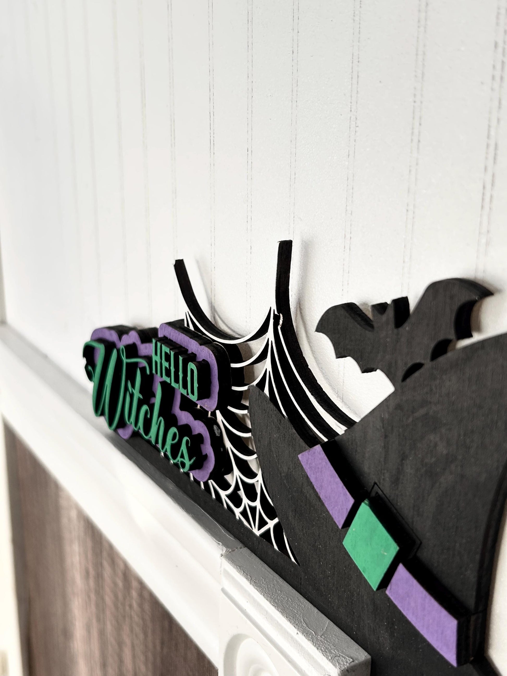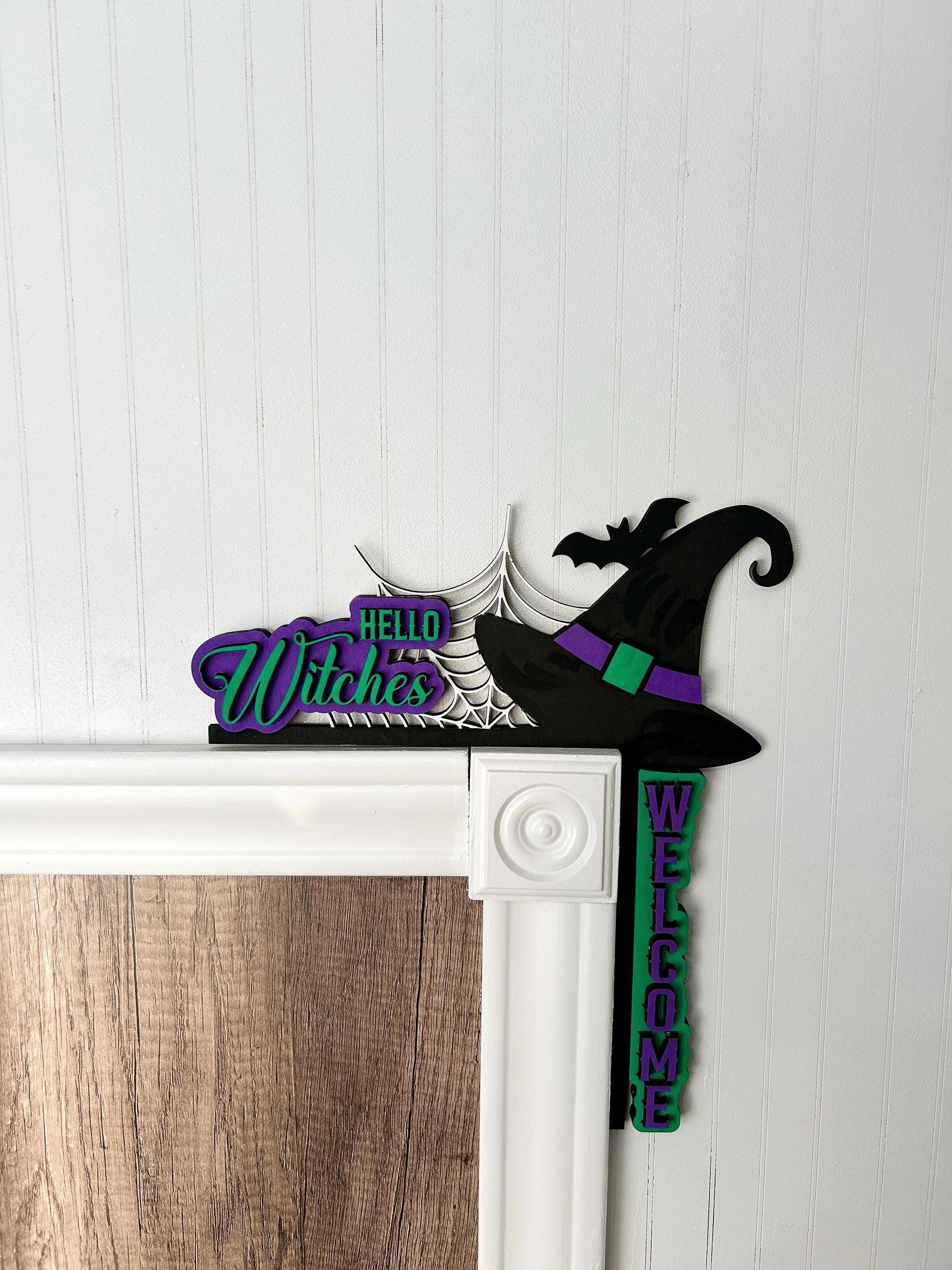 Hello Witches Halloween Door Corner Sign | Welcome Witch Hat with Bat & Spiderweb | Layered Birch Wood Decor