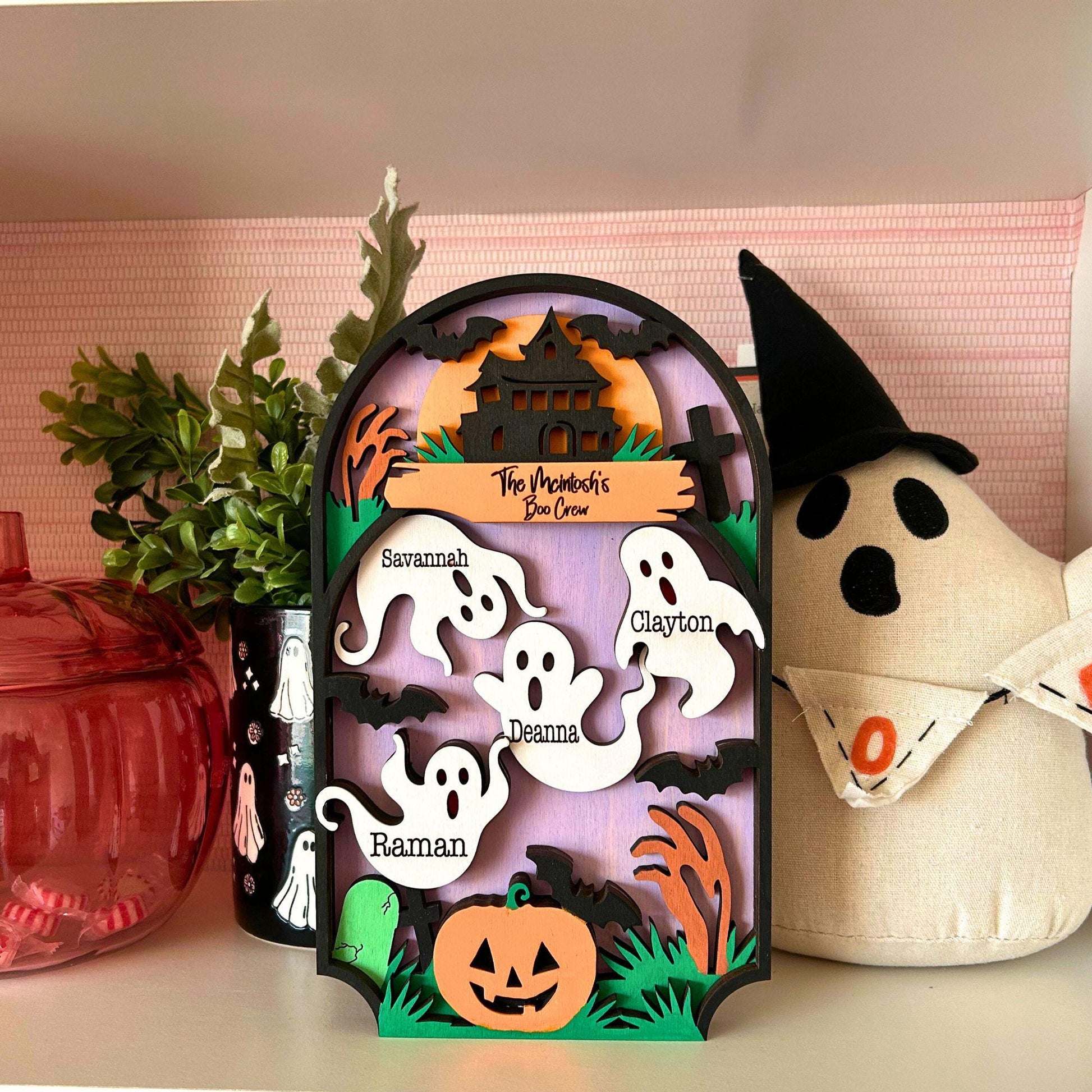 Personalized Ghost Family Sign, Custom Halloween Shelf Sitter with Last Name, Hand Painted Birch Wood Decor, Halloween tabletop decor
